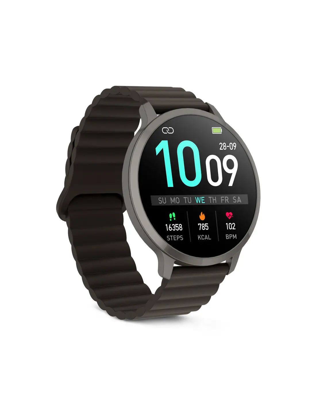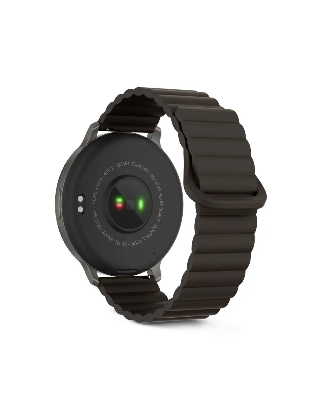 Core 3 Max apuesta por un perfil fino y una sensación ligera que se nota desde el primer momento. Aunque su pantalla es más grande, el reloj se adapta con naturalidad a la muñeca, resultando cómodo tanto en la oficina como en movimiento. La caja de aleación de zinc aporta solidez, mientras que la integración del bisel con la pantalla crea una silueta limpia. El botón lateral es discreto y práctico, y la correa magnética de silicona permite ajustarlo en segundos, sin esfuerzo.